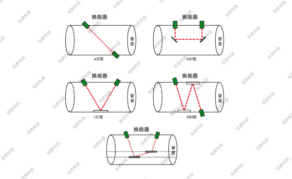 超聲波流量計依據(jù)聲通道的排列可分為單聲道超聲波流量計。單聲道超聲波流量計的量測管段上只組裝一對超聲波換能器,而多聲道超聲波流量計的量測管段上組裝多對超聲波換能器,包括多條獨立的超聲波傳播路徑。多聲道超聲波流量計對流場的適應能力更強,能提高流量計的測量精度;然而,單聲道超聲波流量計廣泛應用于小直徑場合,通過鏡子的應用,單聲道超聲波流量計的聲道布置變得越來越復雜,測量精度也得到提高。依據(jù)聲道的傳播方式,常用的單超聲波流量計主要有Z型流量計、U型流量計、V型流量計、N型流量計和三角流量計。不同傳播類型的聲通道示意圖如圖4-1所示,其中紅色虛線表示聲波的傳播路徑。